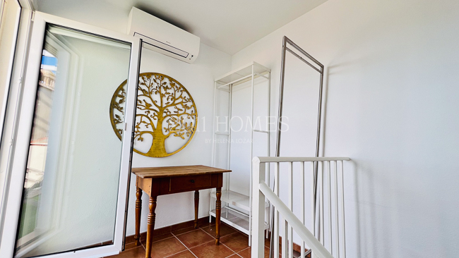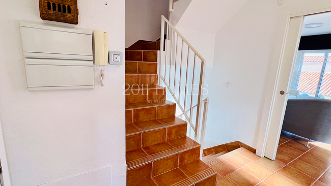 A continuación, y pasando el aseo con lavabo en la planta baja, se accede a un luminoso y acogedor salón orientado al sur con comedor y balcón con magníficas vistas al mar. La escalera conduce a la planta baja, donde se encuentra un bonito lavadero con armarios y una amplia habitación diáfana que en esta descripción catalogamos como un cuarto dormitorio, aunque podría ser mucho más que eso: un espacio perfecto para relajarse o una sala de juegos o hobby con salida a un espacioso patio en forma de L, parcialmente cubierto con toldo y el resto, al aire libre. Hay un trastero esquinero con depósito de agua.