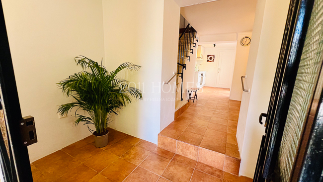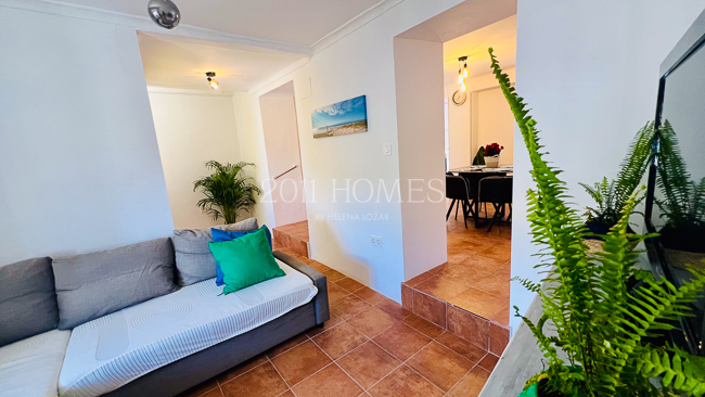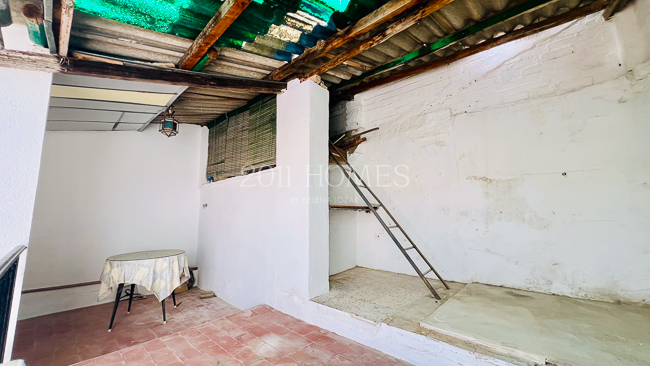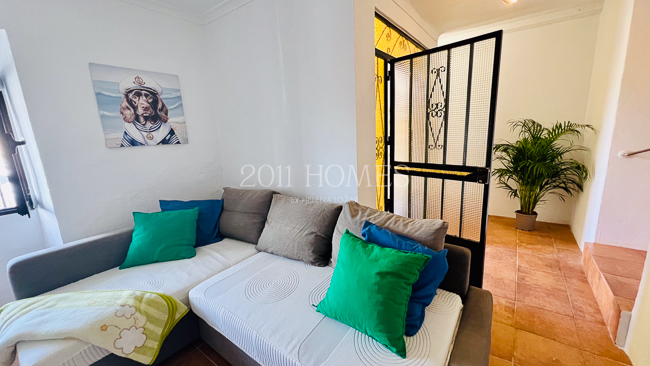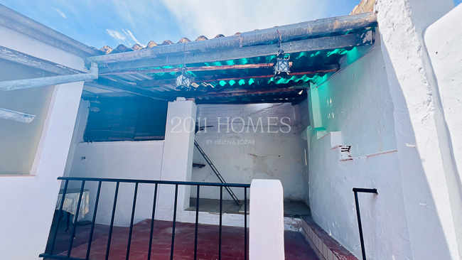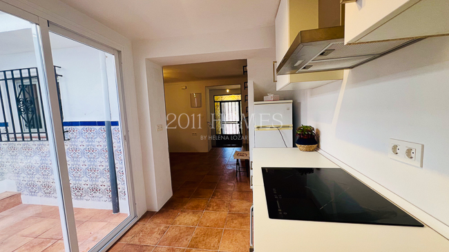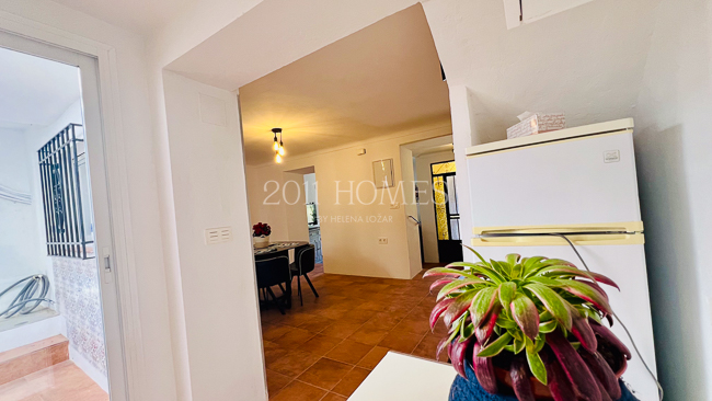 Puerta de madera de doble hoja da entrada al tradicional zaguán. De aquí entramos al distribuidor que conecta varios espacios. A la izquierda, detrás de la puerta tenemos un cómodo espacio para guardar ropa o bicicleta, por ejemplo. A la derecha se abre el salón con ventana que conecta al comedor central. El comedor tiene ventana al patio, escalera y cocina que es muy luminosa y amueblada. El patio con azulejos andaluces lleva a la zona que necesita ser terminada como lavadero cubierto. Desde la cocina, accedemos a través de un par de escalones al bonito cuarto de baño con plato de ducha y mampara. Todo nuevo y listo para usar.
