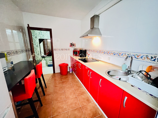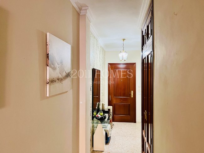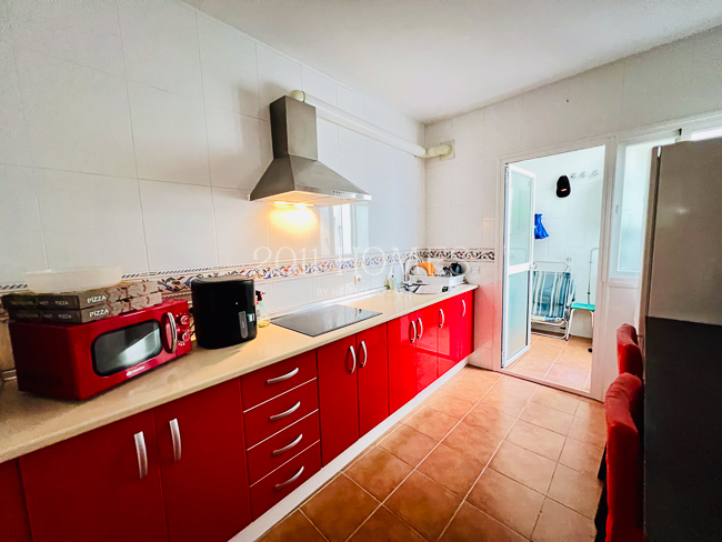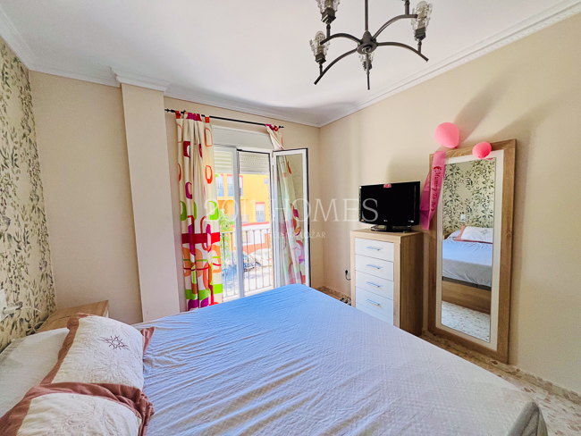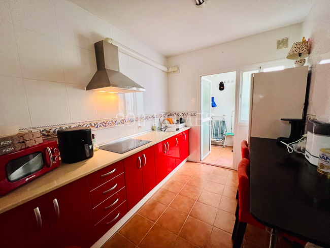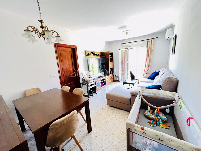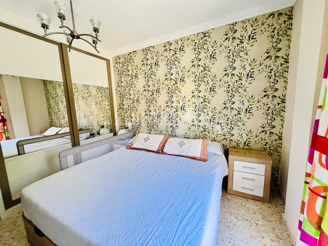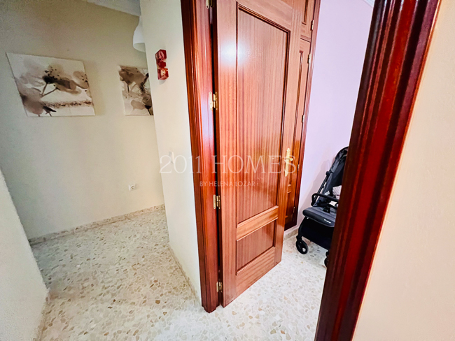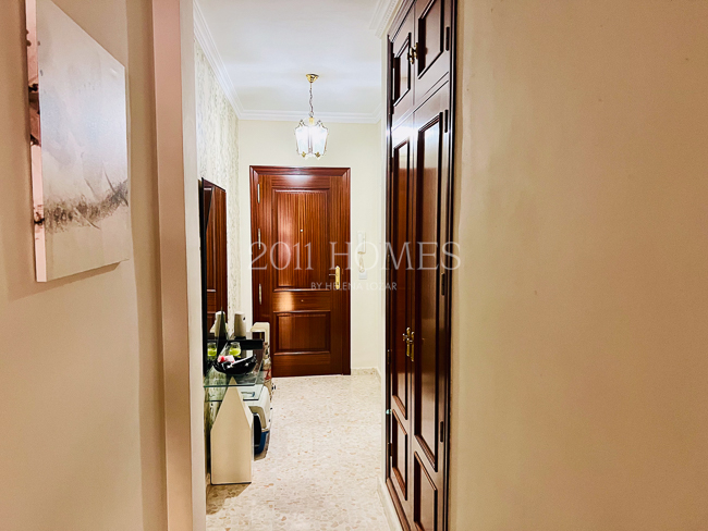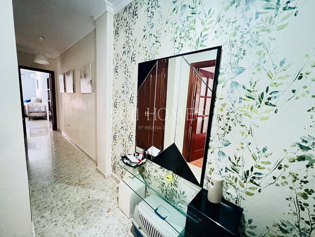Entrando al piso tenemos una cocina bien equipada a la izquierda, con mesa comedor dentro y lavadero aparte. Siguiendo el pasillo nos encontramos un distribuidor a la izquierda entre dos dormitorios y cuarto de baño. Al final, está el salón-comedor con aire acondicionado y balcón, y el dormitorio principal con cuarto de baño en-suite.