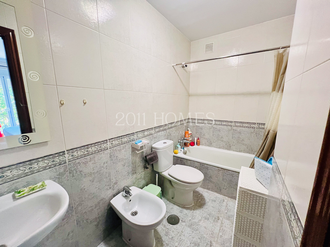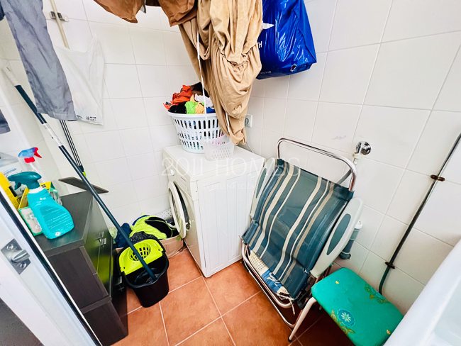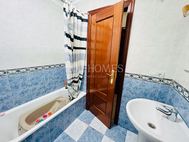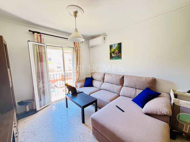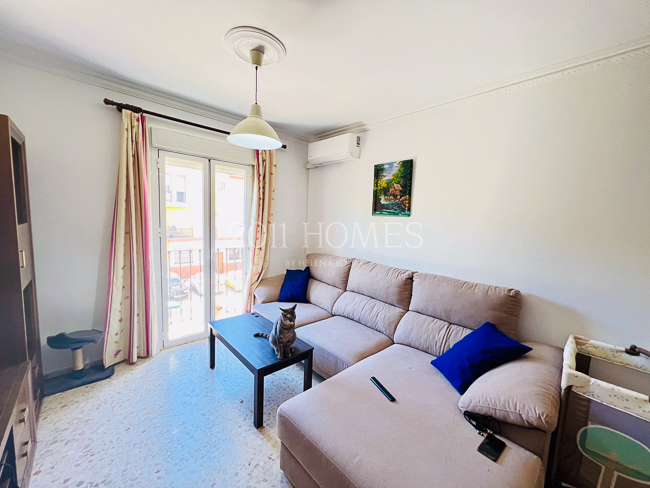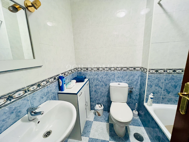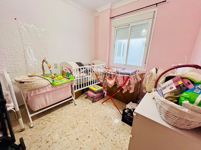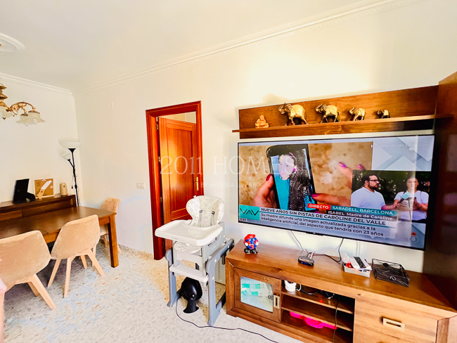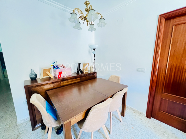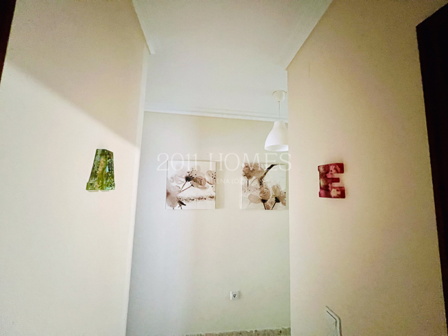 Entrando al piso tenemos una cocina bien equipada a la izquierda, con mesa comedor dentro y lavadero aparte. Siguiendo el pasillo nos encontramos un distribuidor a la izquierda entre dos dormitorios y cuarto de baño. Al final, está el salón-comedor con aire acondicionado y balcón, y el dormitorio principal con cuarto de baño en-suite.